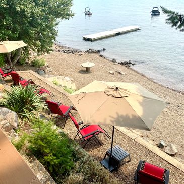 Waterfront with private beach, dock and buoy.
