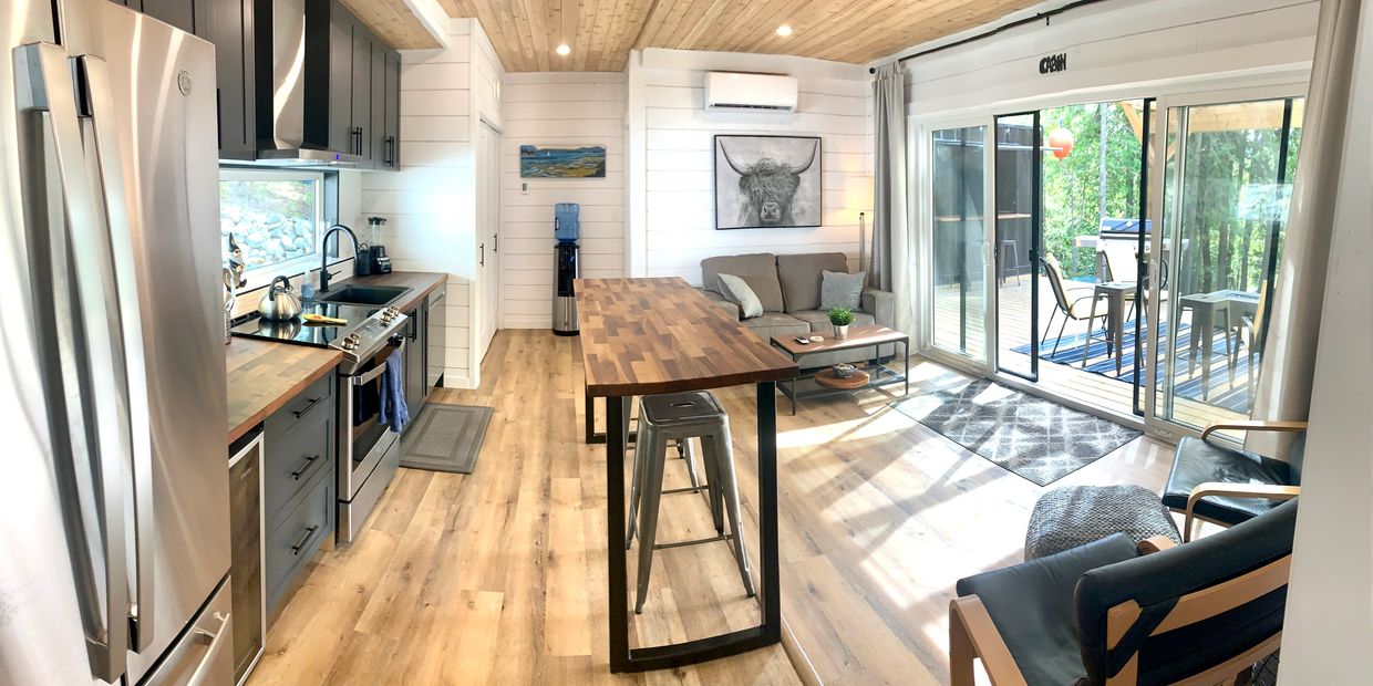 It makes sense that the heart of the home - the kitchen, is located directly in the center of this home. Fully stocked and ample space to cook up your hearts desire. There's a bar height island table with seating for 4, that is open concept and flows nicely into the living area. With one wall of the kitchen/living area made up of glass with sliding patio doors, the room easily opens up to the outdoor deck patio area. Here, your family can all sit under the covered pergola, or uncover it to gaze at the stars. This outdoor patio area is such a flexible space that offers the perfect gathering spot, whether hanging out at the Buoy Bar, relaxing in the HOT TUB, chilling on the patio around the propane fire table or grilling up some grub on the BBQ. You will find 2 private bedrooms at each end of this Sea Can home, set up with queen a bed in each. The master bedroom has a beautiful and spacious 4-pc ensuite bath (shower, toilet, 2 sinks), plus a second 3-pc main bathroom located just off the second bedroom.